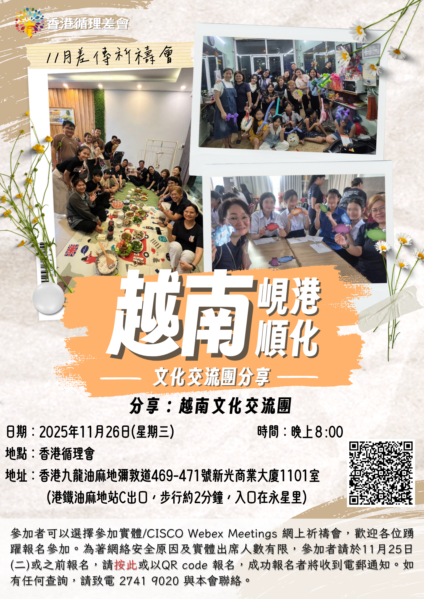 - 請為11月舉行的越南循理會牧者及領袖培訓禱告,記念各參與者在屬靈知識上得著裝備,個人生命得著造就。
